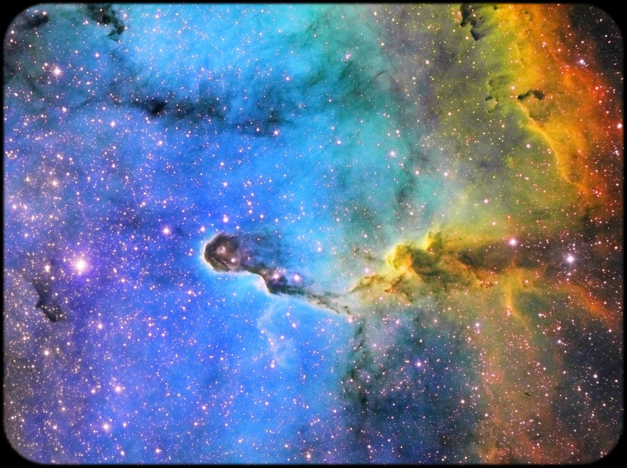 The Elephant's Trunk Nebula is a concentration of nterstellar gas and dust within the much larger ionized gas region IC 1396 located in the constellation Cepheus about 2,400 light years away from Earth. The piece of the nebula shown here is the dark, dense globule IC 1396A; it is commonly called the Elephant's Trunk nebula because of its appearance at visible light wavelengths, where there is a dark patch with a bright, sinuous rim. The bright rim is the surface of the dense cloud that is being illuminated and ionized by a very bright, massive star (HD 206267) that is just to the east of IC 1396A. The entire IC 1396 region is ionized by the